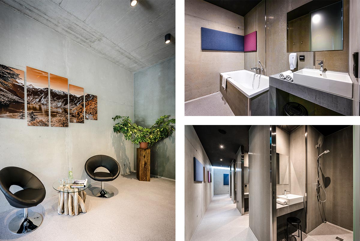 Das Sanitärhaus wurde mit einer Fußbodenheizung versehen, die zusätzlich zu jeder Zeit für eine warme und mollige Atmosphäre sorgt. Die jeweils 4 voll geschlossenen Duschkabinen für Damen und Herren sorgen für einen reibungslosen Ablauf im Sanitärhaus. Entsprechend den Anforderungen an ein 5-Sterne Sanitärhaus sind die Räumlichkeiten großzügig gestaltet.